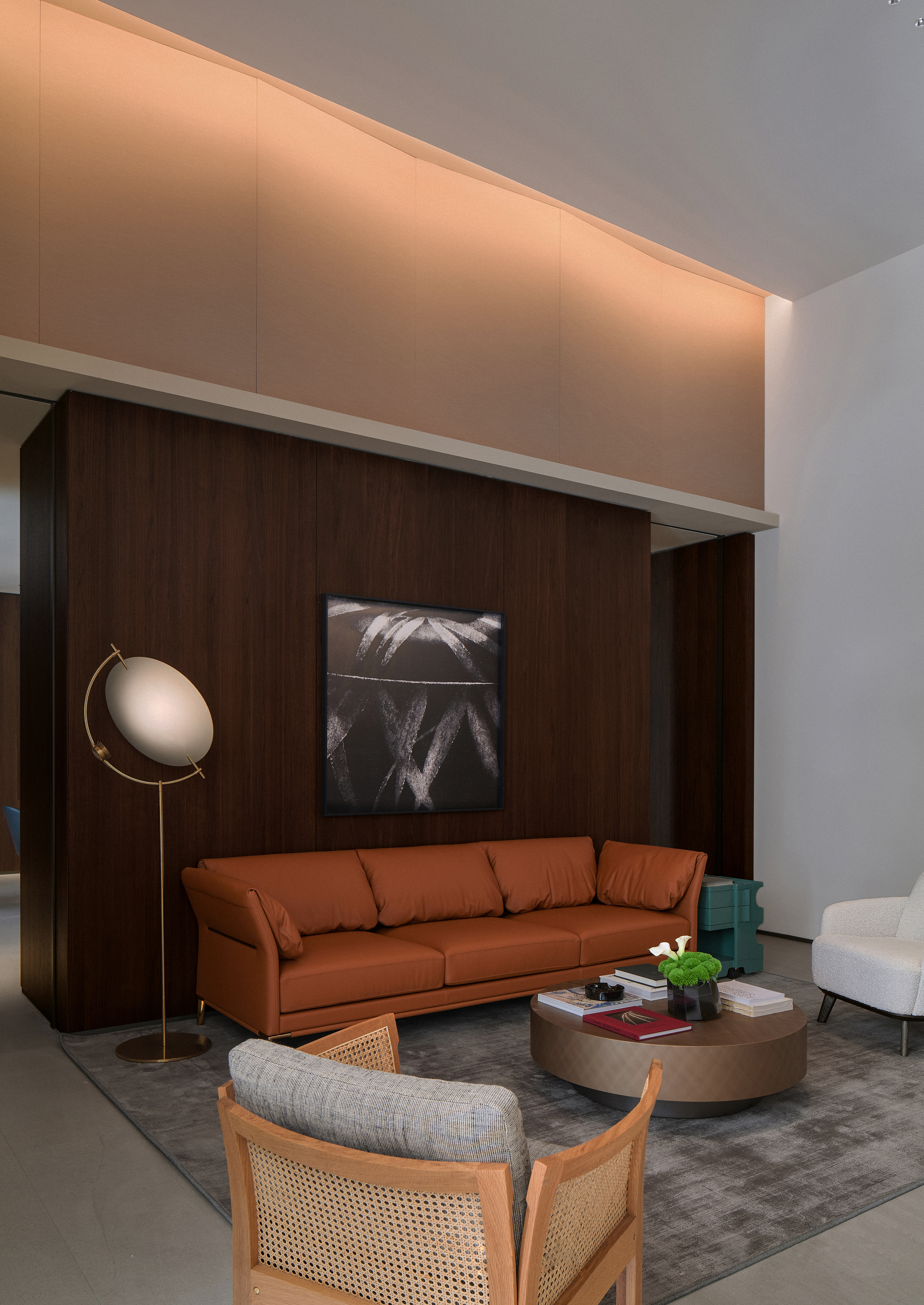 我们采用人工光源精心模拟自然光,以东方美学为灵感,将光的运用提升至艺术的高度。通过巧妙的布局和设计,将天花板“打开”,让阳光的柔和的流淌进室内,为这个空间注入了生命的气息。这样的设计不仅弥补了室内自然采光不足的遗憾,更带来了一种超越日常的舒适体验,通过材质的透射和智能系统的调节让光始终处在人类最舒适的区间。