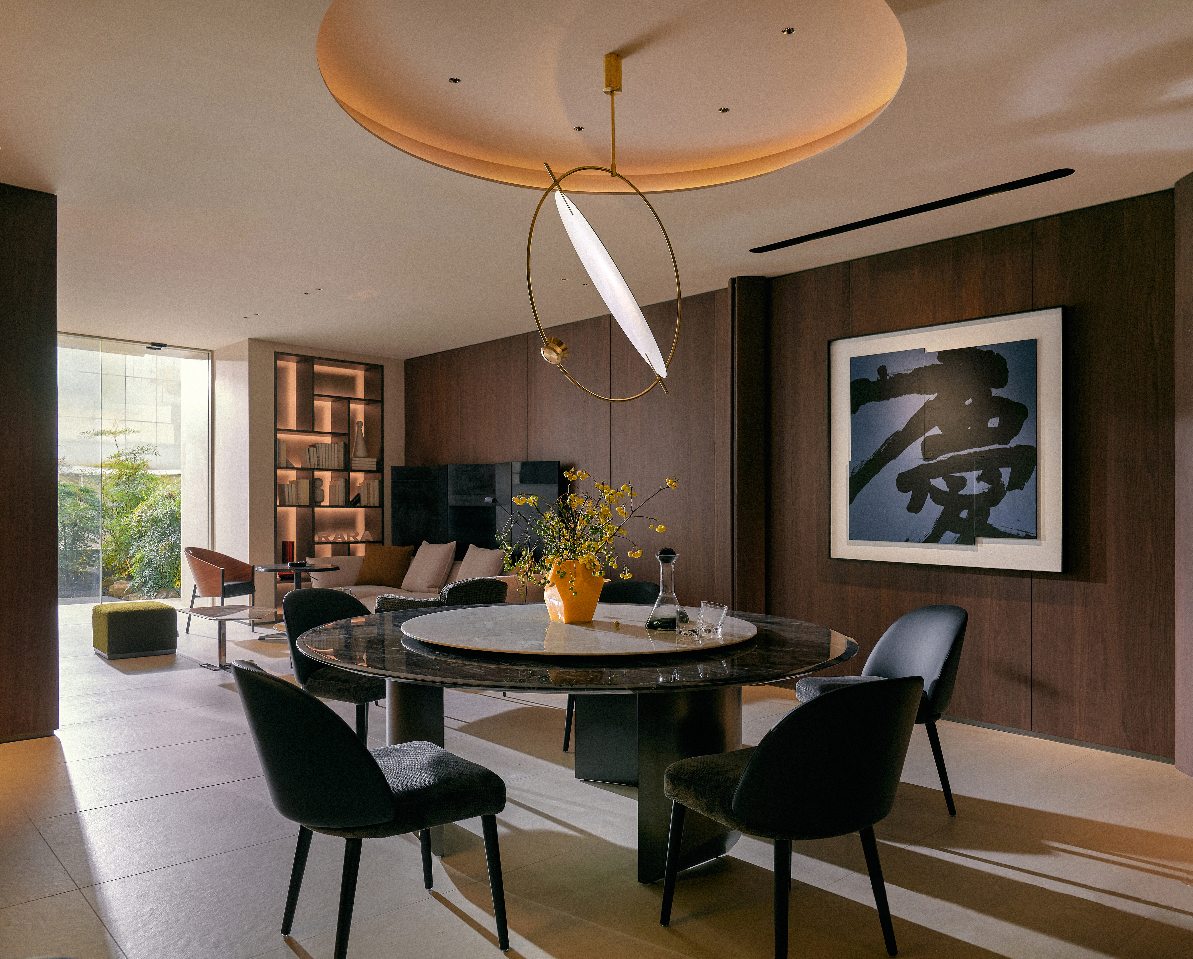 Circular elements run through the space, from the curved outline of the ceiling to the circular shape of the main lamp, echoing the reunion imagery of the Chinese round table with the visual symbol of ‘circle’, and at the same time, alluding to the cosmic concept of ‘heaven is round and earth is square’ and the ‘harmony is precious’ concept of oriental culture. harmony is precious’ philosophy. The circular halo of the lamps is projected on the dining table, forming a centripetal spotlight effect, which invariably strengthens the intimacy of sitting around the table; while the linear light from the hidden strip flows along the elliptical column, which is a metaphor for the winding paths of the corridors in the traditional architecture, so that the modern space and the traditional rituals and procedures can reach a dialogue in the light and shadow.